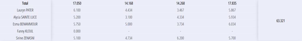 Equipe Fédérale A 7,5 : 10 ans et + SIRINE, Esma, Fanny, LAURYN, ALYCIA départementale 1 5 sur 8 départementale 2 1 sur 6 inter-départementale 18 sur 20 fINALE ID 5 sur 7